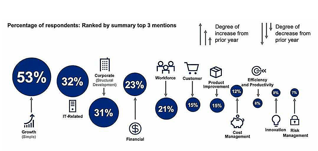 Lần đầu tiên, Công nghệ và Chuyển đổi số lọt vào Top 3 mối quan tâm chiến lược, chiếm 32% tỷ trọng, chỉ sau Tăng trưởng doanh thu và Hiệu quả hoạt động.