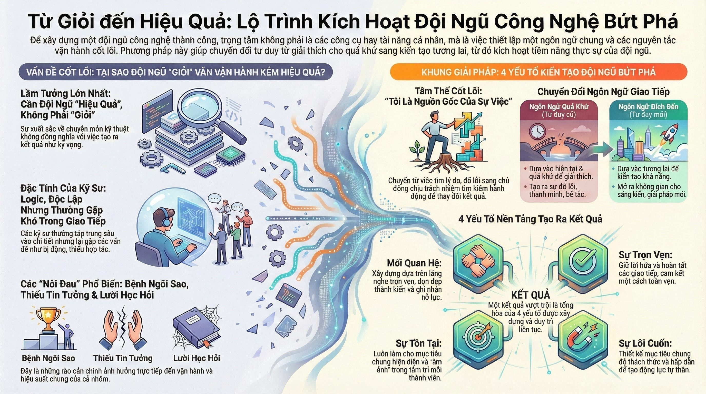 Dân kỹ thuật ai cũng hiểu về Protocol mạng. Hai server muốn nói chuyện được với nhau phải cùng giao thức. Con người cũng vậy. Một đội nhóm rời rạc thường do thiếu “ngôn ngữ chung”. Để vận hành trơn tru, Leader cần thiết lập hai loại ngôn ngữ rõ ràng: