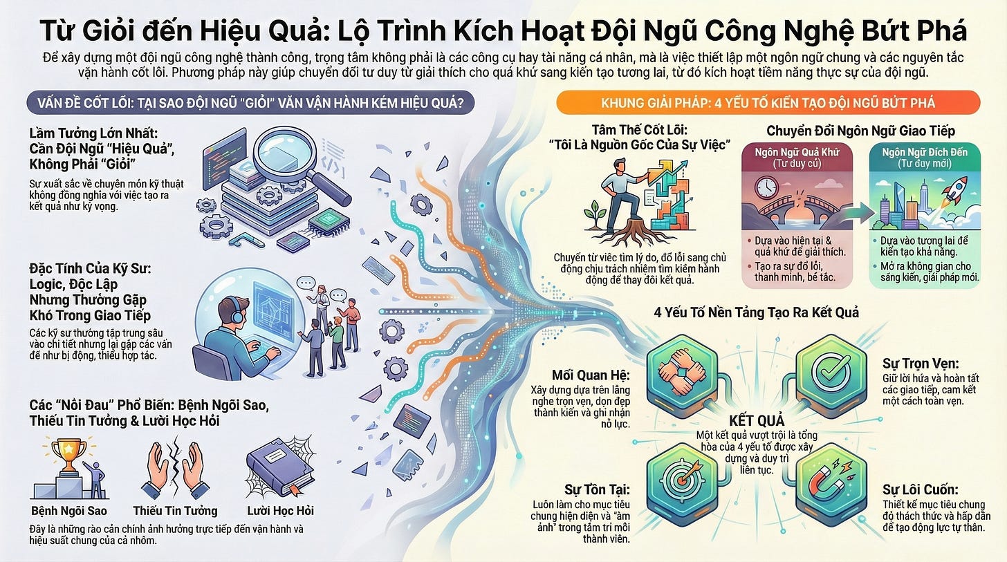 Công nghệ thay đổi liên tục, AI có thể hỗ trợ coding, nhưng con người vẫn là cốt lõi. Một team công nghệ mạnh không nhất thiết phải toàn siêu nhân, mà là một tập hợp những con người có cùng ngôn ngữ, biết lắng nghe và cùng hướng về một đích đến hiệu quả.
