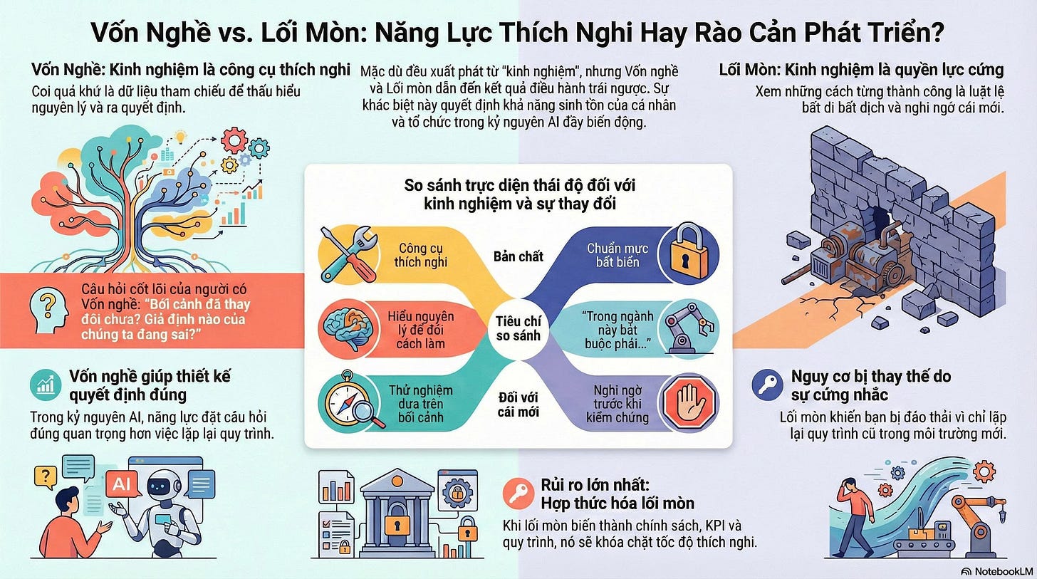 Điểm đáng lo không nằm ở một cá nhân có lối mòn. Điều đáng lo là khi lối mói được hợp thức hóa thành tổ chức (process, policy, KPI, governance) – và bắt đầu khóa tốc độ thích nghi.
