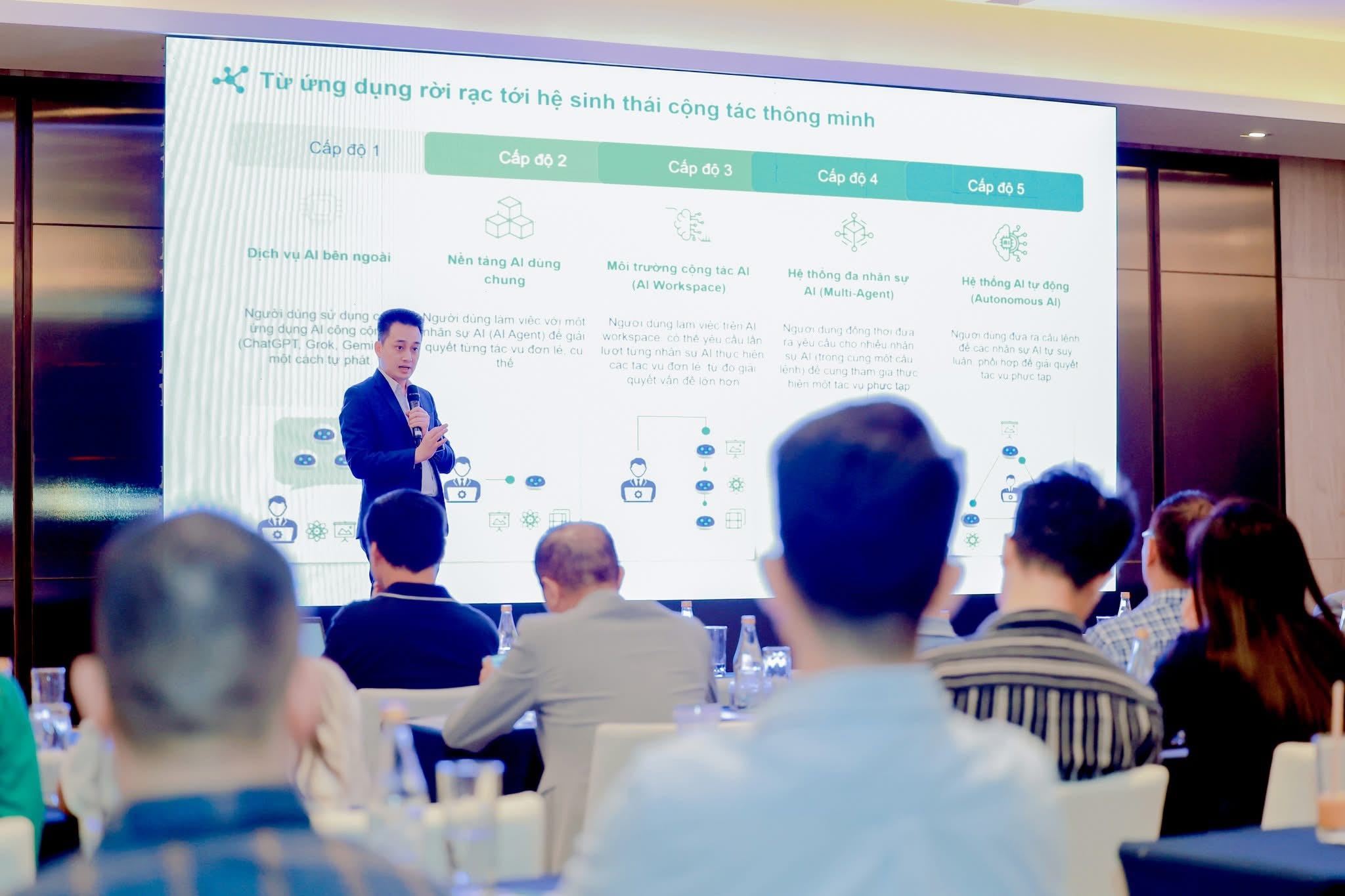 Tiếp nối câu chuyện về lộ trình, diễn giả Nguyễn Quang Minh (FPT Smart Cloud) đã phân tích 5 cấp độ tiến hóa của AI trong tổ chức. Trong đó, đích đến cao nhất là Hệ thống AI tự động (Autonomous AI) – nơi các nhân sự số tự suy luận, phối hợp để giải quyết tác vụ phức tạp mà không cần can thiệp thủ công liên tục.