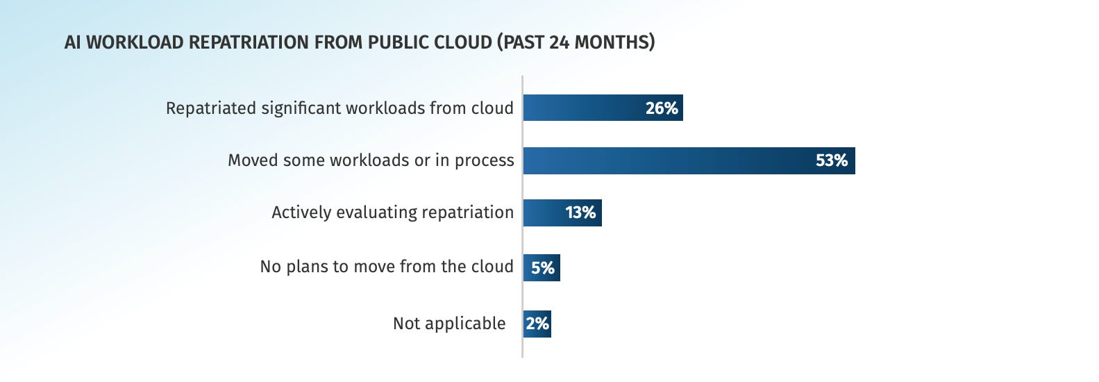 Xu hướng tái cân bằng chiến lược Cloud-first: 79% doanh nghiệp đã hoặc đang chuyển một phần AI workload từ public cloud về on-prem/private, cho thấy sự dịch chuyển rõ rệt trong tư duy hạ tầng.